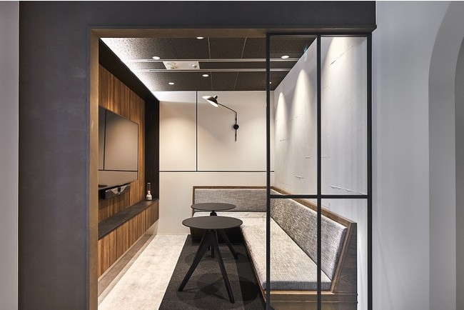 扉ではなく、適度なこもり感を持たせた半個室スペース。造作のL型ソファがあり、横並びで正面のモニターを見ながら社内ミーティングやWeb会議ができます。また、回転型の昇降テーブルが設置してあるので、快適な高さで作業ができる個人の集中スペースとしても。リフレッシュエリアとしてソファでくつろいだり、急な来客や短時間の打ち合わせでお客様をご案内できたりと、マルチな使い方ができるスペースです。