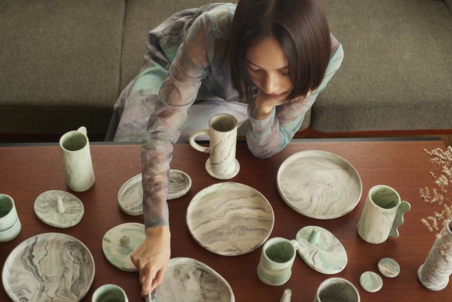 陶芸作品を様々なコーディネートにレイヤードしたような風合いに仕上がり、