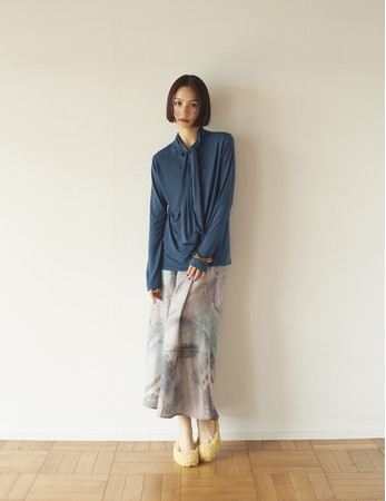 季節を問わない素材感は、タンクトップからタートルネックまで、どんなトップスにも合う万能なスカートです。