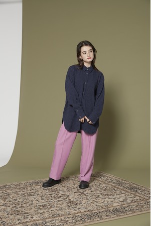 ストレッチ性のあるシャーリング素材を使用したシャツです。シワになりにくく、羽織りとしても最適です。ヒップも隠れる着丈ですので、ゆったりしたBIG シルエットです。ストレスフリーで着用頂けます。