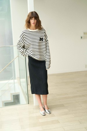 ボーイッシュなボーダートップスにフェミニンなツイードスカート、