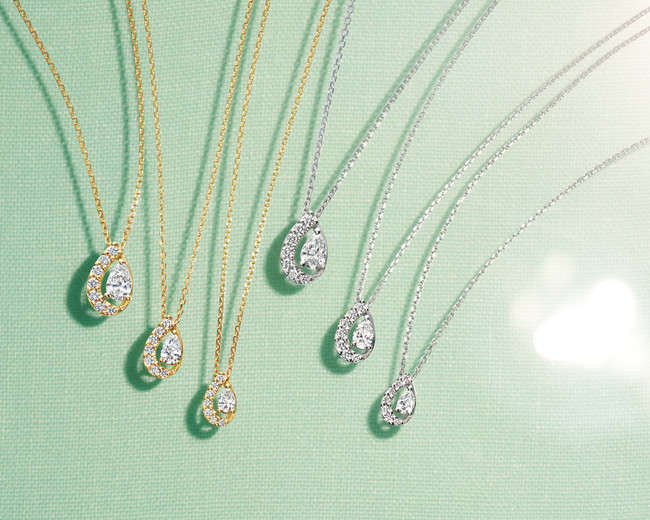 透明感のある煌きを放つペアシェイプカットダイヤモンドを繊細なメレダイヤモンドで包み込んだ、潤いのある輝きが魅力のネックレス。中心を少し右にずらしたアシンメトリーなデザインが、ベーシックで正統感のある雫モチーフにモダンな印象をプラスします。