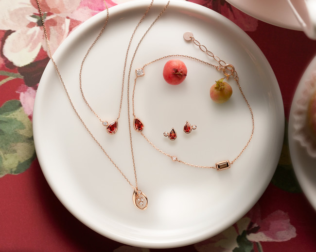 イチゴのような雫型のガーネットに、ホイップクリームのようにホワイトトパーズがあしらわれたネックレスとピアス。そこに添えられるのはローズピンクのシャンパンをイメージしたネックレス。