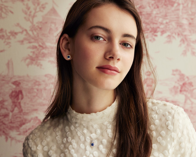 プラチナとダイヤモンドでラピスラズリを取り巻いたネックレスは、お揃いのピアスと共に、クラシカルなムードを漂わせます。ブランドカラーでもあるラピスラズリの深い青い色をお気に入りの香りのように身につけ、大人のエスプリと嗜みを匂わせて。
