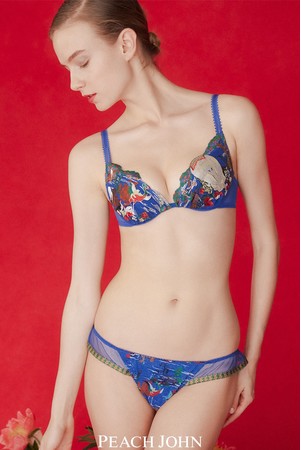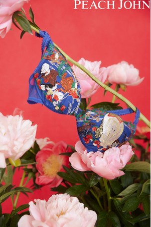 新色は、近年展覧会のたびに圧倒的な入場者数を記録する国民的人気画家、伊藤若冲の大作≪鳥獣花木図屛風≫をオマージュした「若冲ブルー」。2つの屛風を合わせ、当時の日本には生息しない鳥、獣、花々など無数の動植物を華やかなプリントと刺繡で再現しました。大胆な極彩色と、鮮烈なブルーのコントラストが際立つデザインです。一対の屏風を左右のカップに分けたアシンメトリーなデザインと、屛風の枠をイメージしたショーツ部分の装飾的なレースが、アートの美しさを引き立てます。L字型ワイヤーと取り外し可能なパッドで寄せ上げ、ふっくら谷間をメイク。サイドベルトはパワーネット1枚、サイドボーンなしで軽い着け心地です。