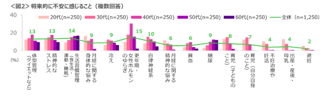 将来的に不安に感じることは、「更年期・女性ホルモンのゆらぎ」が最も高く、特に40代は突出している。<図2>