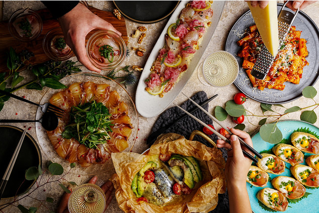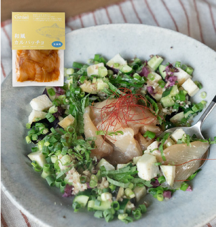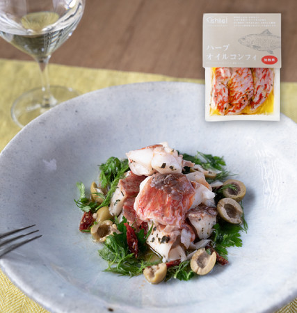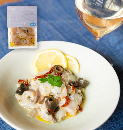 玄界灘の天然鮮魚を、福岡県八女市で育てられた希少なハーブと長崎県産藻塩、イタリア製オリーブオイルでマリネしました。
