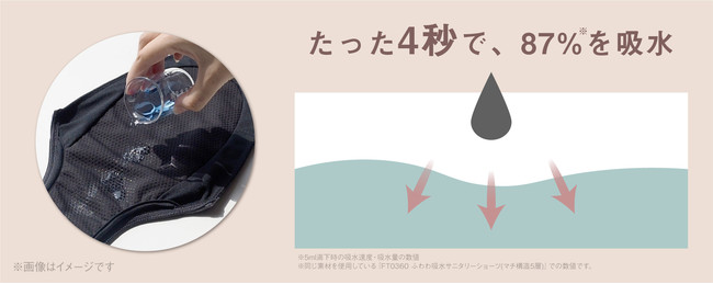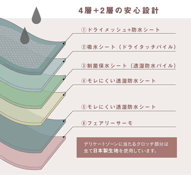 肌側は吸水速乾性に優れ、柔らかな風合いの「ドライメッシュ」を採用。前後左右を「透湿防水シート」が囲むことでモレを防ぎます。吸水してもベタつきにくい「吸水シート」、吸水性が高く、臭いの原因となる菌の繁殖を抑える「制菌保水シート」、ムレ感を軽減する「透湿防水シート」が層になっています。身生地には保温性や発熱性、吸放湿性に優れた「フェアリーサーモ」という日本製生地を使った、オリジナルの浮かせマチ構造になっています。