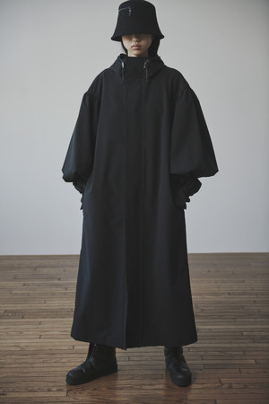 袖にボリュームを付け、特徴付けたロングコート。撥水機能が備わるアクティブな生地感と、分量感のあるシルエット。レインコートにもなり、どの季節にも着ることができるアイテムは、特徴のあるフォルムが、機能性のあるコート・スタイルに新たな視点を加えます。
