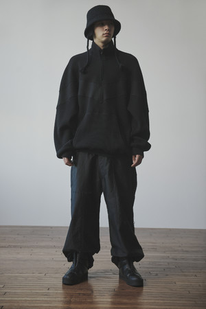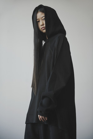 ワッフル織が強調されたような、凹凸のある生地がメインにもちいられたトップス。ビッグシルエット。袖や、裾の生地の洗練された落ち感が、ベースがアクティブな要素のフォルムをスタイルに変えています。
