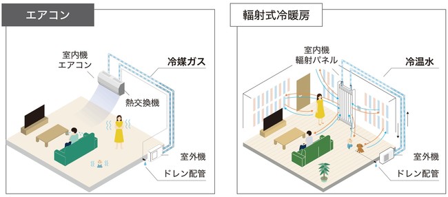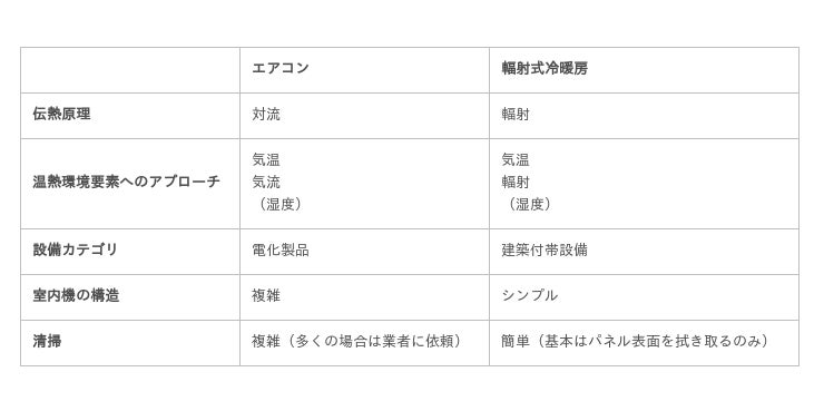 対して、輻射パネルは輻射の原理を用いて空間に作用するので、風など熱を伝える媒体がなくても空間が温まったり冷えたりします。また設備としての違いとして、エアコンは家庭用電化製品であるのに対し、輻射パネルは建築付帯設備という扱いになります。