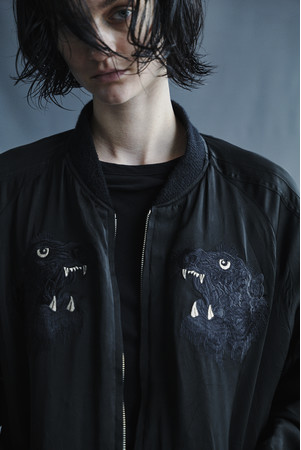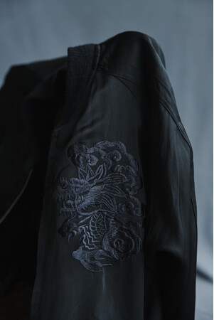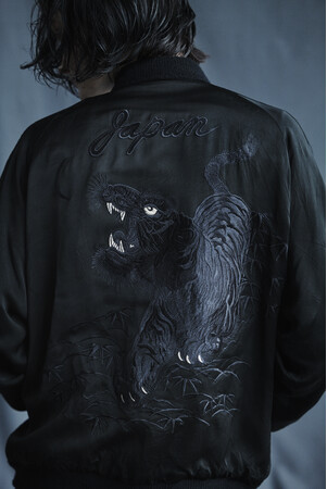 黒で表現された虎──テーラー東洋が所蔵するヴィンテージの中でも特に希少な一着のデザインをもとに、黒一色の表現に拘り、虎の縞模様や躍動する体躯を刺繍の立体感のみで再現。日本の職人だけが可能な刺繍技術であり、 Y'sのデザインへの拘りと日本の技により叶った、日本のクリエイティビティが凝縮した表現です。