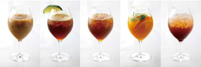 『ロイヤルミルクティ・カルーア』リプトン発祥のロイヤルミルクティに、カルーアを合わせた濃厚な味わい。『アールグレイ・ジントニック』スパイスの香りが爽やかなジントニックと、ベルガモットの香りが相性ぴったり。『アッサムティ・ハイボール』豊かな香りとコクをもつアッサムを使用し、茶葉の甘みをほんのりと感じるカクテル。『セイロンティ・ラムオレンジ』爽やかなセイロンティに、オレンジの甘みとラム酒の香りが効いた仕上がり。『ダージリン・キールロワイヤル』紅茶のシャンパンと言われるダージリンを使用し、白ワインとカシスリキュールで作りました。