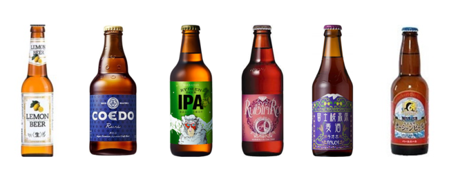 左から「レモンビール」「コエド プレミアム 瑠璃 Ruri」「八海山ライディーンビールIPA」「富士桜高原 ラオホ」「九十九里 オーシャンビール ペールエール」