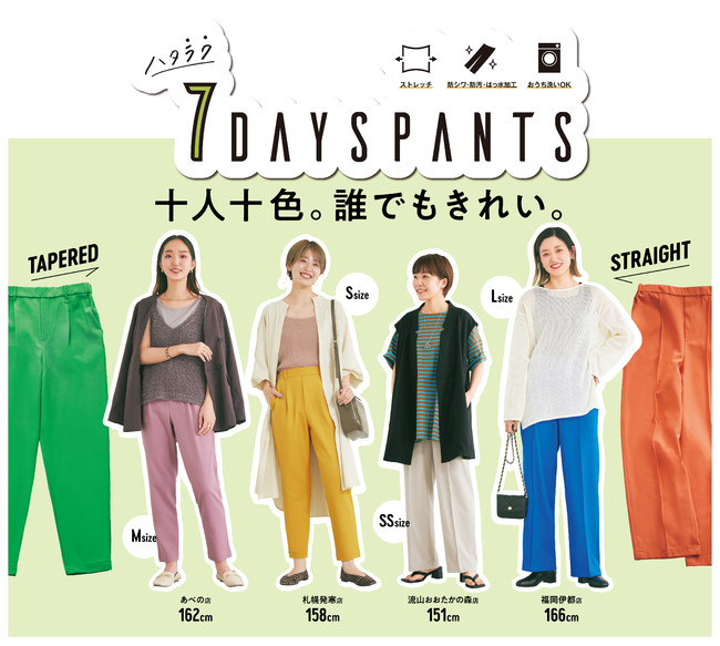 「毎日はきたくなるマルチパンツ」がテーマのハタラク7DAYSパンツは、美脚見えのシルエットときれいめにもカジュアルにも使いやすい素材感にこだわっています。シワ・防汚加工などお手入れが楽になる6つの機能がついた、レプシィム定番の人気パンツです。豊富な機能とはき心地の良さからリピーターの方も多く、2021年春の発売から累計25万本以上を販売しています。2022年秋の新色として、無地のテーパードパンツ5色、ストレートパンツ4色の計9種類が発売します。