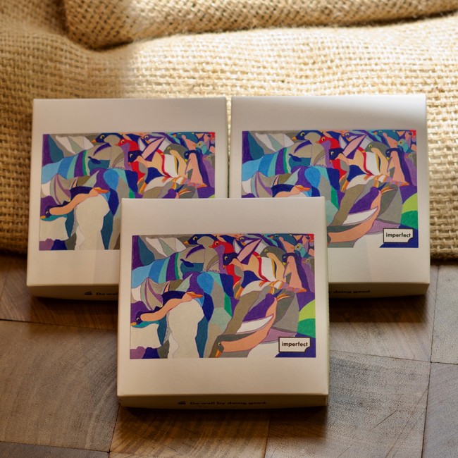 その中でも、澁田さんのペンギンが勇気をもって海に飛び込もうとしている姿を見て、私たちimperfectの「お客さまと共に社会課題の解決を目指す」ファーストペンギンでありたいという想いと重なり、使用のご相談をさせていただきました。またペンギンの姿が可愛く且つ色使いも魅力的ですので、商品を手に取っていただいたお客様にも、楽しく、挑戦する気持ちになっていただけたら嬉しいです。