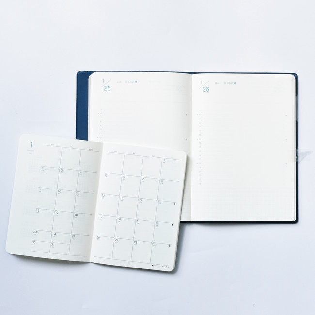 当製品は半年分冊(上半期:2023年1月-6月 下半期:2023年7月-12月)タイプのデイリー手帳(B6)2冊と小型ミニマンスリー手帳(A6)1冊がセットになっています。