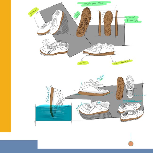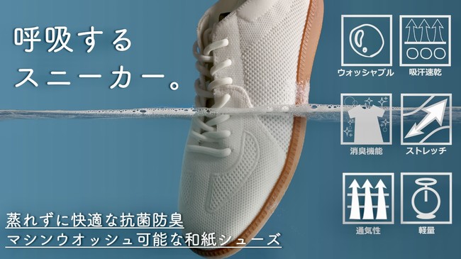 高機能和紙スニーカー『Scooter GT』は、和紙を素材に使用したことで裸足で履きたくなるような肌触りと、通気性や防臭性をはじめとする履き続けたくなるような機能を実現いたしました。