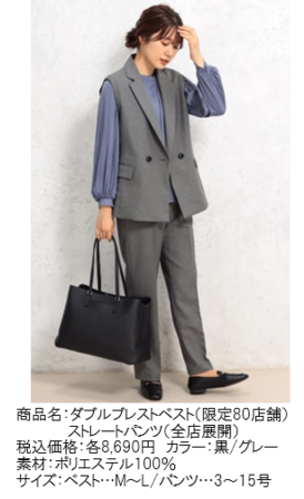 昨今のシーンレスかつシーズンレスなアイテムへの需要の高まりを受け、AOKIでは「ベスト&パンツセットアップ」を発売いたします。カラーは季節問わずビジネスでもカジュアルでも着まわせる黒とグレーで展開。やや長め丈のベストは体型カバーができるだけでなく、縦のラインが強調されスタイルアップが叶います。また、半袖・長袖のトップス、ワンピースなど幅広いアイテムの上から1枚羽織るだけでコーディネートの雰囲気を変えられ「こなれ感」を演出できます。さらに、セットアップのストレートパンツはきちんと感があり、ビジネスでもご着用いただけます。