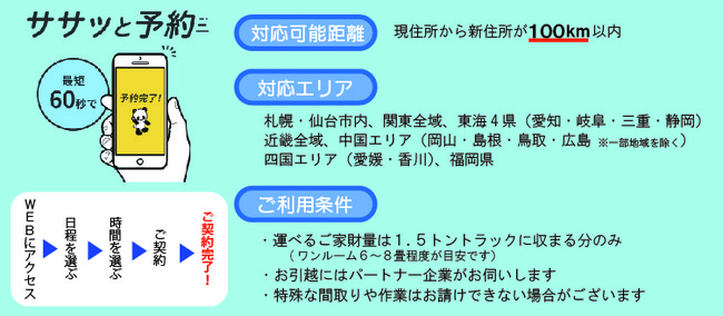 株式会社サカイ引越センター(大阪府堺市:代表取締役社長 田島 哲康)は、単身でのお引越のお客様向けに展開している、お引越契約までパソコンやスマートフォンだけで完了できる「ササッと予約」の対応可能お引越距離を2022年8月22日より、50kmから100kmへと拡大しました。