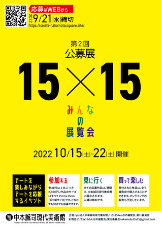 NPO法人中本誠司現代美術館(仙台市 理事長:大内光子)は全員参加型の公募展「15 ×15 みんなの展覧会」を2022年10月15日~22日に開催します。
