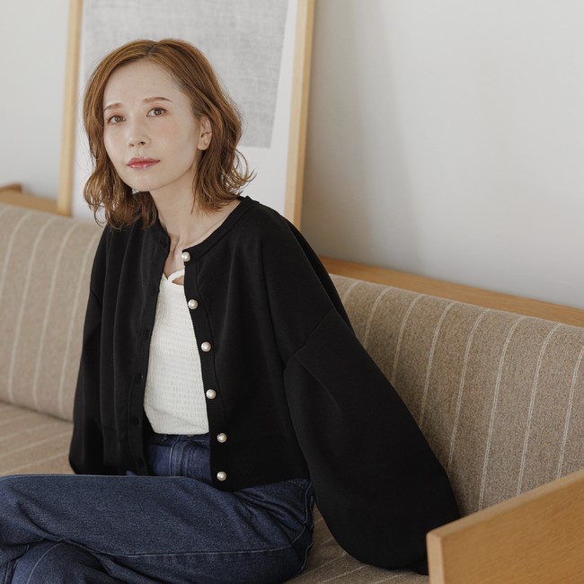 たっぷりなボリュームの袖と、大きめパールボタンで女性らしさ抜群のカーディガンです。