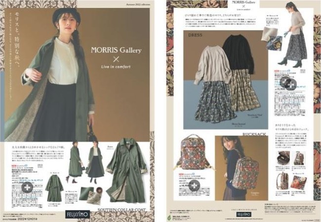フェリシモが展開する「Live in comfort[リブ イン コンフォート]」は、モリスギャラリーのテキスタイルを活かした3つのアイテムを発表、8月3日からウェブ販売を行っています。モリスギャラリーの新作は、ステンカラーコート、ワンピース、リュックの3点です。詳細は、 ウェブ特集ページのほか、デジタルカタログでもチェックできます。
