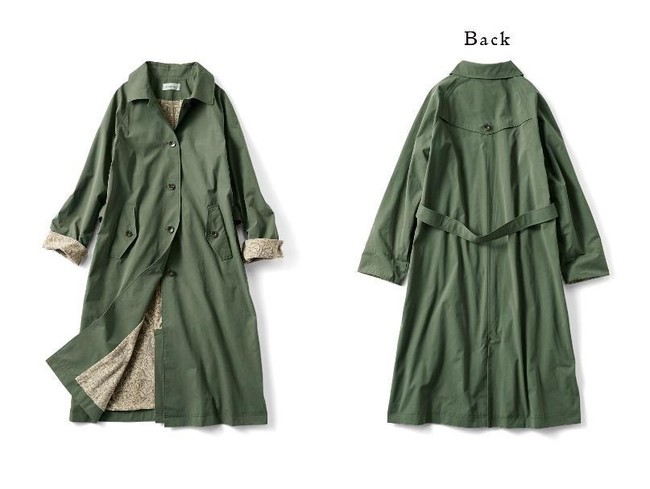 ロング丈のステンカラーコートの裏地に、モリスの「Acorn」をプリント。自然を愛するモリスらしい、秋のどんぐり柄を裏地に忍ばせています。薄手で軽い着心地で、身ごろ・袖口・ポケットの裏地はフリース素材で暖かさも兼ね備えたコートです。ラフにはおれる上品な色合いのカーキに、すっきり見えるゆったりシルエットなど、大人にうれしいディティールをちりばめています。