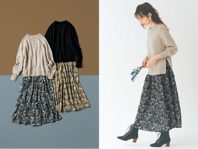 瞬時にコーデが決まるドッキングワンピースに、シックで華やかなモリスのデザインが合わさったアイテムです。トップスはシンプルなもちふわニットで、落ち感のきれいなフレアースカートはモリスの代表柄「Strawberry Thief(いちご泥棒)」と、海藻の流れるような動きを表現した「Morris Seaweed」の2種類を選ぶことができます。締め付け感のない着心地ながら、きちんとしたいシーンにもぴったりな上品コーデが完成する一枚です。