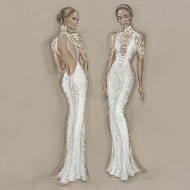 – ドレス 2:シャンデリアパール ドレスは、何千ものパールの糸が流れ落ちるように飾られています。30 人もの職人が 700 時間をかけて、シルクチュールのマイクロプリーツ、細かいパールの装飾、スワロフスキー クリスタルを手刺繍で縫い留めました。