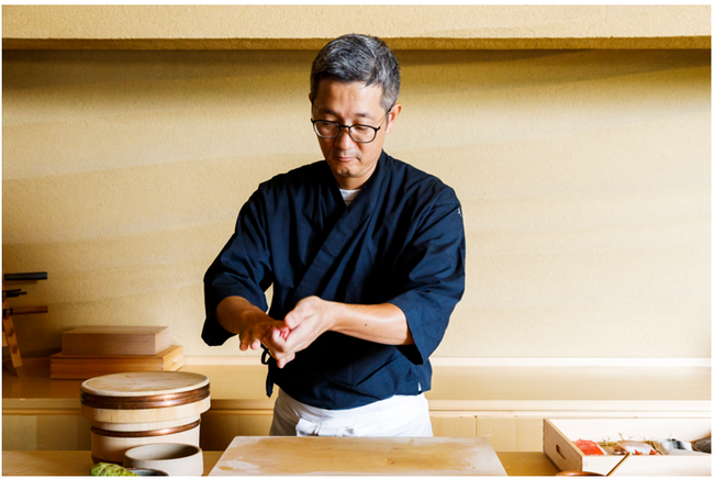 シラカチの奥に掲げられた暖簾をくぐると漆喰の土間空間と天然檜(ひのき)を用いたカウンター10席のみという隠れ家のような佇まい。メニューはおまかせコースのみで、豊洲、福岡長浜、大将の地元広島の市場から仕入れた魚介を丁寧に扱い、鮨やおまかせの一品に仕立てます。旬の食材の旨味が凝縮した一貫を味わえる至福のひと時をご堪能ください。