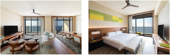 沖縄本島西海岸に美しく広がる壮大な海や、瀬良垣島の岩肌や原生植物など眼下にご覧いただけるオープンエアバルコニーが付いた、約114平方メートル の広さを誇るスイート。存分にお寛ぎいただけるスイートキングサイズのベッドをご用意。独立したリビングルームには広々としたダイニングエリアや簡易キッチンも備えており、ワンランク上の優雅なご滞在を堪能いただけます。