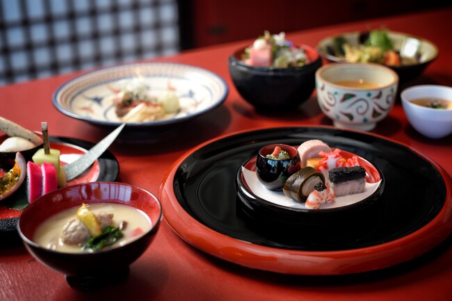 沖縄の伝統的な食文化を琉球料理伝承人である、シラカチ統括料理長嘉数順が独自のアイデアでひもとき、沖縄県産食材は元より日本全国の旬の食材にこだわり、琉球和会席を完成させました。この琉球和会席では、地元生産者のもとに嘉数自ら足を運び、厳選したイラブー(ウミヘビ)などの地元食材や、琉球王朝時代の宮廷料理を彷彿とさせる目にも鮮やかな前菜などがお楽しみいただけます。