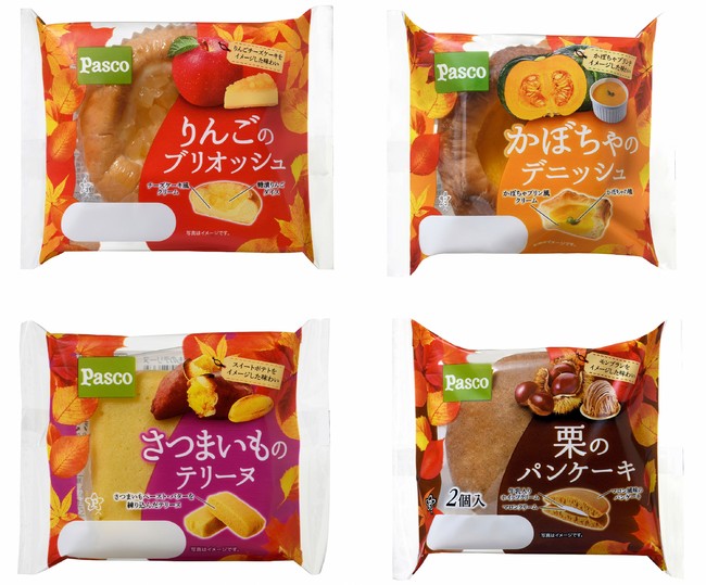 敷島製パン株式会社(Pasco)は、秋の味覚が楽しめるシリーズとして「りんごのブリオッシュ」、「かぼちゃのデニッシュ」、「さつまいものテリーヌ」、「栗のパンケーキ2個入」の4アイテムを、9月1日から10月31日までの期間限定で、関東、中部、関西、中国、四国、九州(※)地区で発売します。