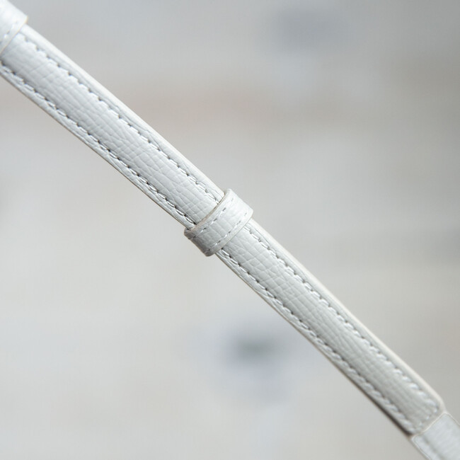 平紐のレザーストラップは、ストラップ先端のループをカラビナに通してスムーズに着脱可能。ストラップ内部に芯材を組み込む「肉盛り」を施すことで立体感を持たせ、カジュアルからオフィスシーンまで様々な装いに馴染む上品な意匠に仕上げました。