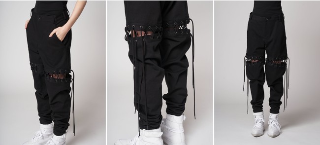 ハーフ丈の位置で潔くカットされた上部と下部をロング・コードで編み上げたパンツ。ロックなデザインですが、深めのアングルドポケットとパンツのシルエットからクラシカルな印象もうかがえます。カラータイツやプリント柄レギンス等のボトムインナーとの組み合わせで色々なテイストにアレンジすることができます。ジャケットと同じく黒染めを重ねたブラックデニムを使用。着こむほど馴染んでいき、時間経過による生地の変化を楽しめます。PANTS 70,400 yen