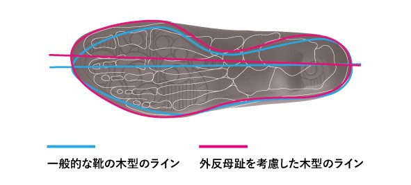 fitfitの靴の基本となる木型は、人間工学に基づき、センターラインを親指寄りに振ったオリジナルの「足なり設計」。普通の靴に比べてセンターラインを親指側に寄せることで、前足部を幅広にすることなく親指がまっすぐ伸びるフォルムを実現しています。