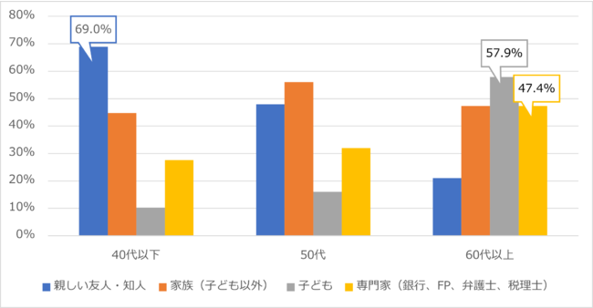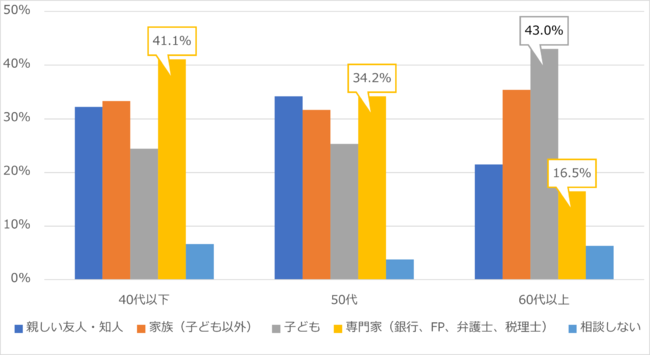 40代以下と50代については「専門家」へ相談するとの回答が多く、60代以上では「子ども」が多いことがわかります。一方、60代以上においては「専門家」へ相談するとの回答が他の年代と比べて大きく少ないことがわかります。この結果は年齢が上がるにつれて、「専門家」へ相談できる環境が極端に少なくなる事を示唆しているかもしれません。