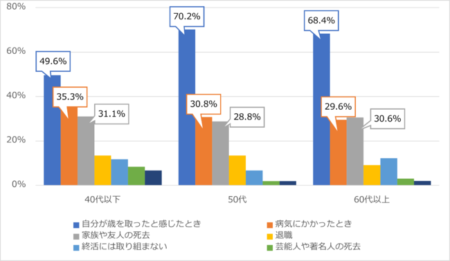 終活に取り組むきっかけはすべての年代で「自分が年を取ったと感じたとき」が最も多い結果となりました。