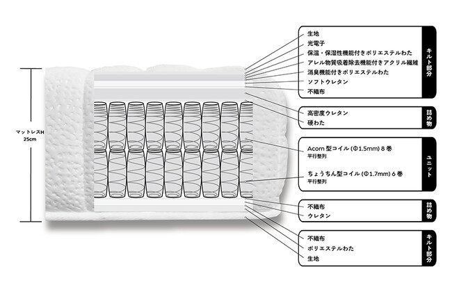 「ENNN / MATTRESS」は、こだわりの8層構造とコイルのダブルクッション構造。8層構造には、快適な温度に保つ「光電子(R)」(※1)素材や、消臭や防虫効果などの清潔さを保つ素材、そしてムレを軽減抑制するための通気を確保する高密度ウレタンを採用しています。マットレスの大部分を占めるコイルは、上段に柔らかさのある8巻コイル、下段に上段の柔らかさをしっかりと支える6巻コイルを使用。包まれるような柔らかさを維持しつつ、一つひとつのコイルが体全体を支えることで、底つき感のない安心感ある寝心地をサポートします。