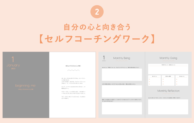 自分の本当の願いを知ることは、理想の未来を実現するために欠かせないステップ。Me手帳では数陽学に基づいた毎月のテーマ・メッセージ・セルフコーチングワークを通して、自分の心と対話し、心の奥にある願いに気づくことができます。「手帳の書き方や使い方がわからない」そんな方でも質問に答えていくだけで、自然と手帳に向き合えるようになっています。
