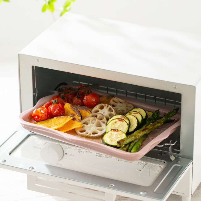 くすみカラーとフリルの形状がかわいい、食材をのせてそのままオーブントースターで調理ができるプレートです。大き目のサイズなのでちょっとしたおかずを作ることもできます。凹凸を活かして天ぷらなどの、サクサクと食べたい料理をのせるのもおすすめです。オーブン使用可能なので、具沢山トーストをプレート上で作成し、そのまま焼くこともできます。こぼれたチーズなどもエンボスのおかげではがれやすく、お手入れしやすいのも嬉しいポイントです。