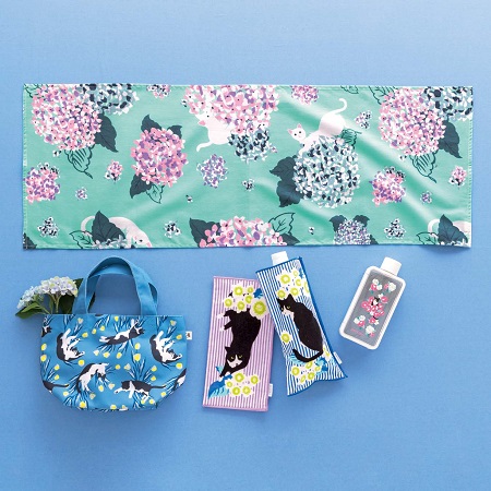 粋でモダンな猫たちとお花の和柄のデザインが人気のコレクションです。あでやかに咲き誇る椿やあじさい、またたびの花と猫たちが優美に描かれています。お出かけのお供に便利なペットボトルタオルや飾りたくなる手ぬぐいなど、毎日をおしゃれにセンスアップしてくれるアイテムです。