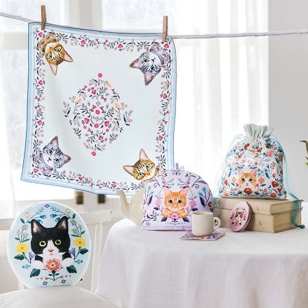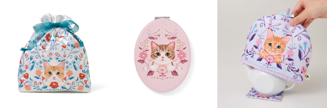 〈きんちゃくポーチ〉は、オーガンジーリボンが華やかなデザインです。〈コンパクトミラー〉は、楕円と淡いピンクのデザインが上品で大人っぽい印象です。開くと片面が便利な拡大鏡になっています。〈コースター付きティーコゼー〉にはミント色の小さなリボンがアクセントに。可憐な猫と一緒に暮らしを楽しめそうです。
