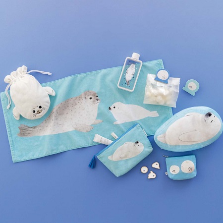 アザラシ親子のほのぼのとした姿とまんまるなお顔がキュートなコレクションです。クッションやフェイスタオル、きんちゃくなど、ほわほわした毛並みを楽しめるアイテムも充実しています。どれも大人が持ちやすいシンプルなデザインで、さわやかなブルーも魅力です。