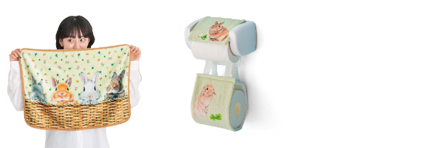 〈ミニブランケット〉は、ひざ掛けにぴったりのサイズ。4匹のうさぎたちがカゴの中からこちらを見つめる姿に、キュンとしてしまいます。〈ペーパーストッカー〉は、2匹のうさぎがかわいいデザイン。ふたのすき間に差し込んでセットするタイプで、予備ロールが収納できます。