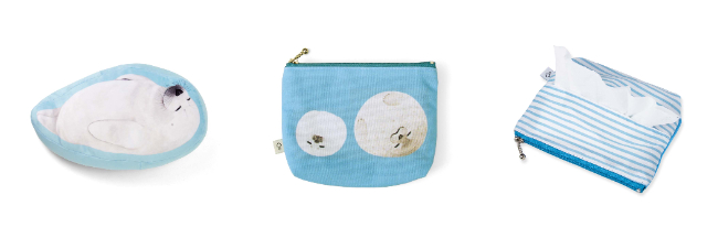 〈ダイカットクッション〉は、子どものアザラシがごろんと横たわる姿にキュンとするデザイン。おうちでのくつろぎタイムに、ひざに乗せるのにちょうどいい大きさです。ほわほわした毛並みが楽しめます。〈ティッシュケース付きポーチ〉は、仲よく並ぶアザラシ親子のまんまるボディーに癒やされます。ポケットティッシュが入る裏面は、さわやかなストライプ柄です。