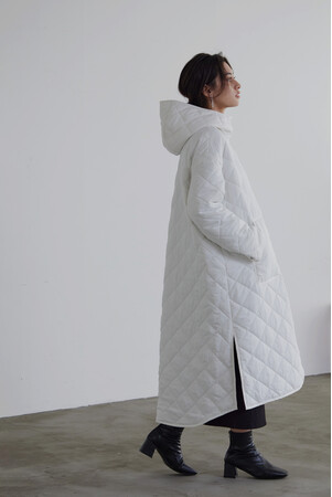 蓄熱保温効果のある再生中綿を使用したキルティングロングコート。