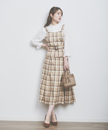 あいみさん:流行りのマーメイドシルエットでスタイルアップできます。チェックやくすみピンクが秋っぽいカラーリングです。