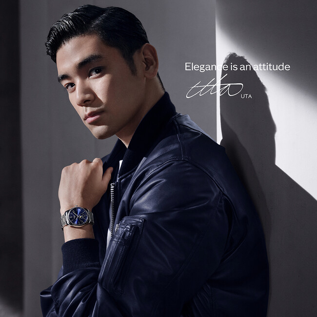 研ぎ澄まされた感性と強さを秘めたエレガンス。UTAさんの腕に光るのは、ロンジンのフラッグシップライン“ロンジン マスターコレクション”の中で、シンプルなデザインの中に、ウォッチメイキングの機能美が際立つモデル。スタイリッシュなサンレイ加工のブルーの文字盤に、スポーティーでモダンな印象を与えるステンレススティールブレスレットをコーディネート。月の満ち欠けを表すムーンフェイズ機能や、シースルーのケースバックからはムーブメントの精緻な動きを楽しむことができます。